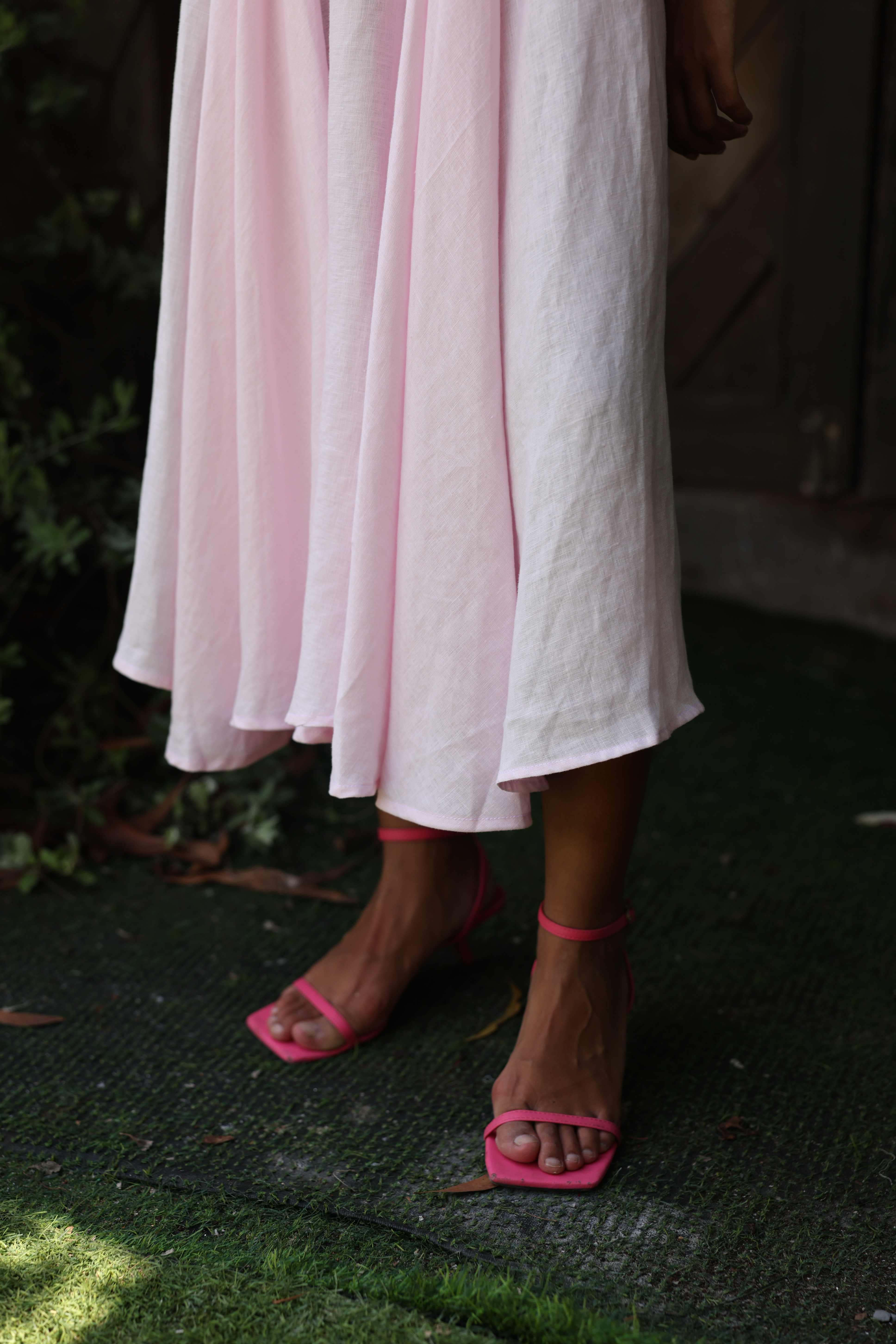 The pink linen sundress is a breezy and feminine staple, perfect for sunny days and effortless charm.