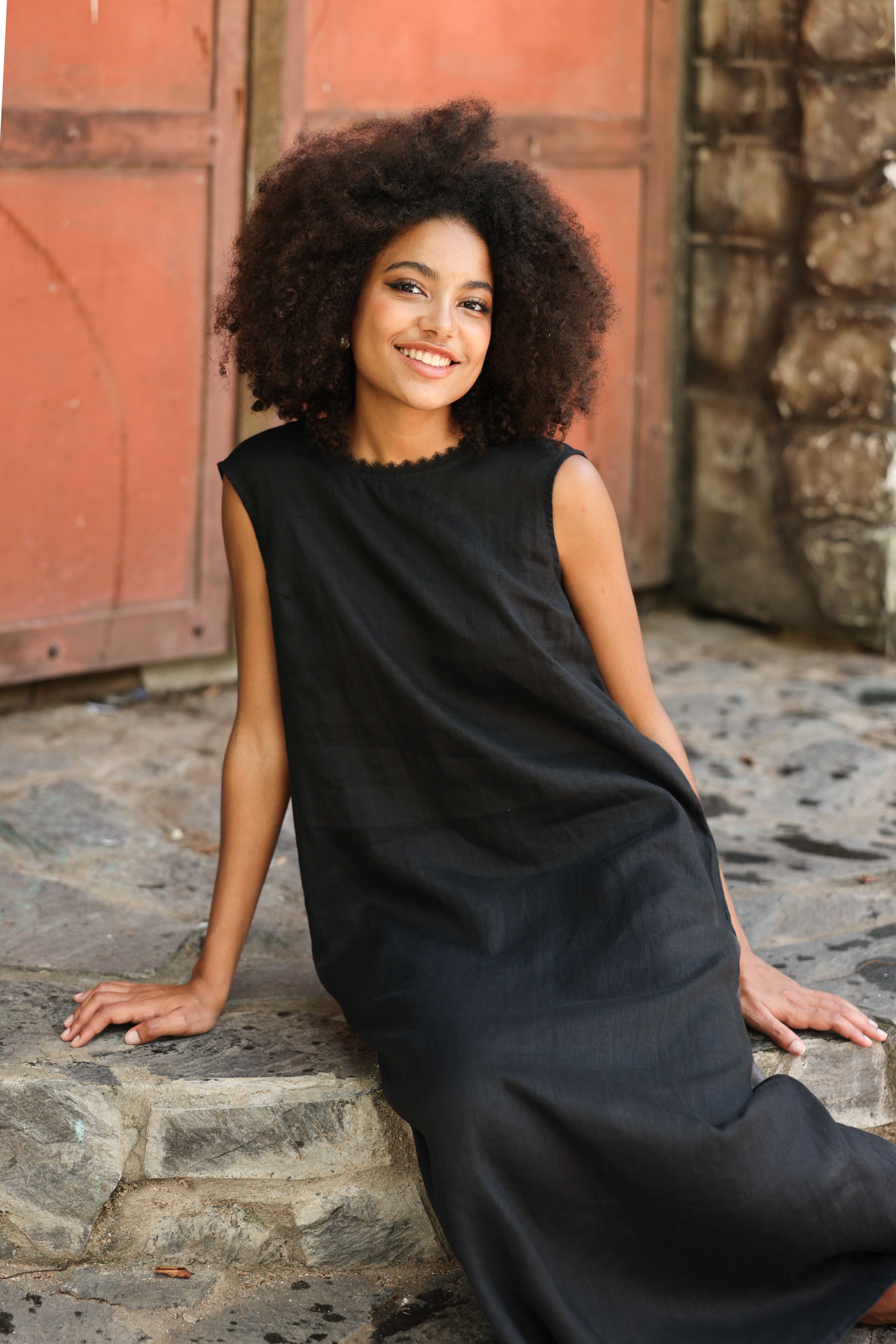 The sleeveless linen maxi dress is a timeless piece that blends breezy comfort with effortless elegance.
