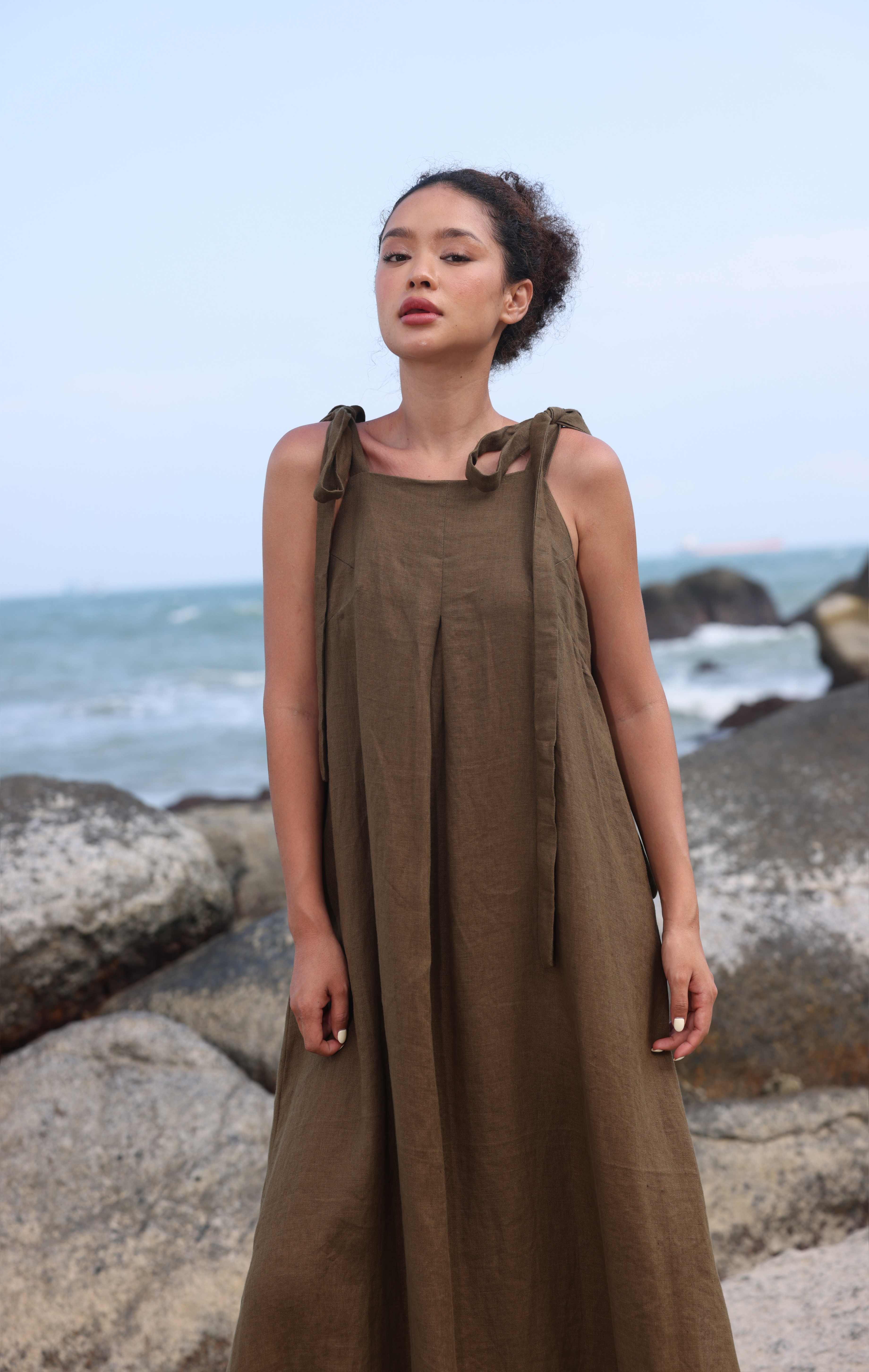 This tie shoulder linen dress captures timeless simplicity and natural grace, made for warm days and relaxed elegance.